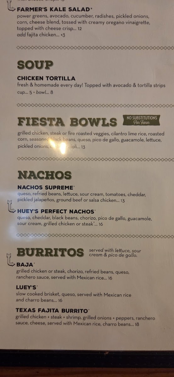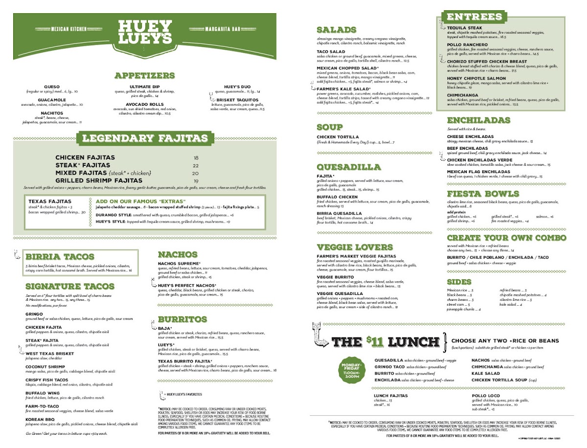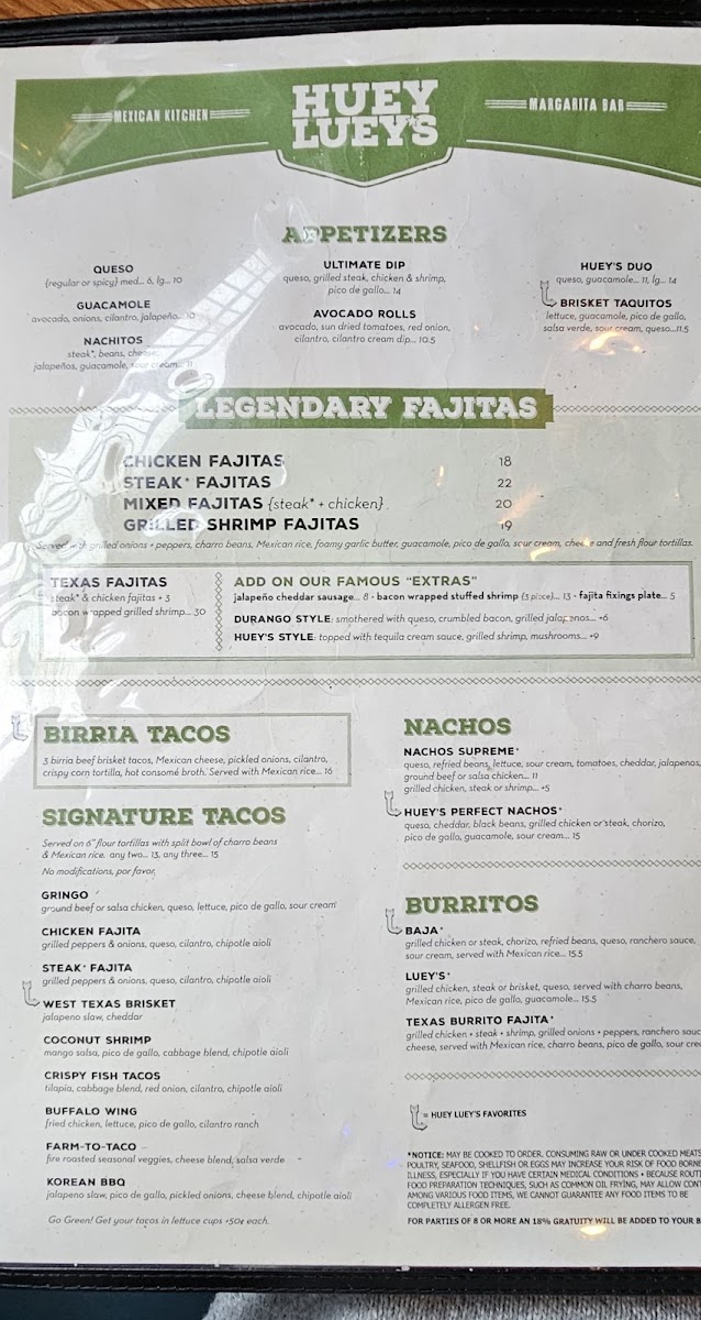 At Huey Luey's Mexican Kitchen & Margarita Bar, you'll find a menu that captures the vibrant and bold flavors of traditional Mexican cuisine with a refreshing twist. Whether you’re craving sizzling fajitas, mouth-watering tacos, or a zesty guacamole, each dish is crafted with care and the finest ingredients. Pair your meal with one of their signature margaritas or a refreshing cocktail, and you're in for a treat that will have you coming back for more. Located at 3338 Cobb Pkwy N in Acworth, Georgia, this spot is perfect for a casual meal or a lively night out with friends. From the first bite to the last sip, Huey Luey's Mexican Kitchen & Margarita Bar Menu brings the true taste of Mexico to the heart of Georgia.